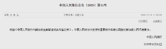 12月15日金融一线消息,央行公告,根据《中国人民银行与新加坡金融管理局合作备忘录》,中国人民银行决定授权星展银行有限公司担任新加坡人民币清算行。