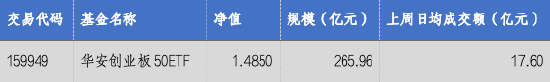 创业板50ETF(代码:159949)流动性充足,过去一年日均成交额14.54亿元,排名深交所ETF前列。该指数基金最新规模265.96 亿元,是市场上跟中创业板相关指数较大的基金之一。