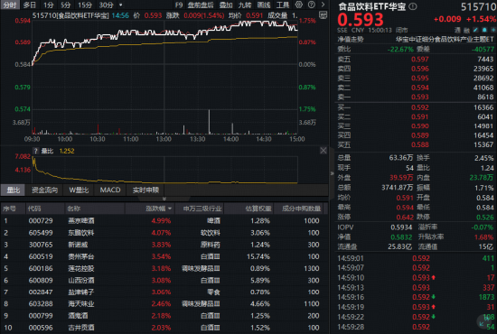 2026年首个交易日(1月5日),吃喝板块迎来开门红!反映吃喝板块整体走势的食品饮料ETF华宝(515710)开盘后震荡拉升,盘中场内价格最高涨幅达到1.71%,截至收盘,涨1.54%。