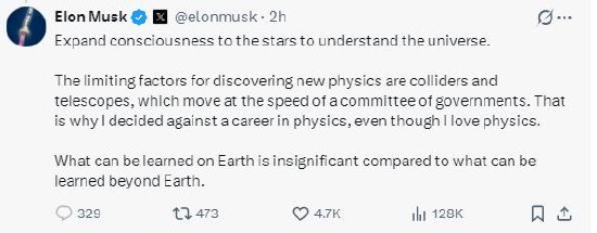 核心提示:  一位网友在X上发帖称:“埃隆·马斯克期望Grok能够解决物理学难题。他对科学家和研究人员不感兴趣,因为他们做事效率低下。工程师才能把事情办成。”  马斯克回应称:“将意识拓展至星辰之上,以了解整个宇宙。  发现新物理现象的限制因素在于对撞机和望远镜,而它们的运行