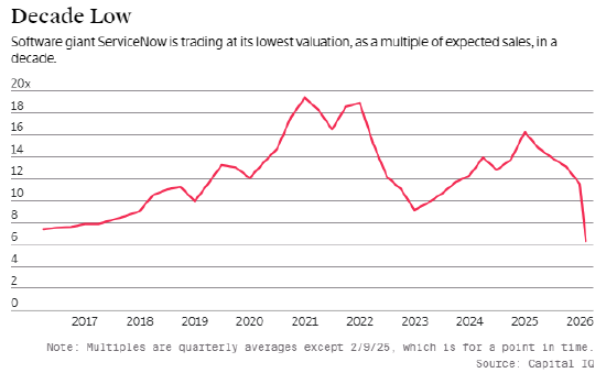 软件股在上周惨烈抛售之后开始反弹,但力度远不足以扭转整个板块的颓势。市场担忧人工智能会让现有软件产品失去价值,这种恐慌情绪早已蔓延开来。包括 ServiceNow、、 在内的多只知名软件股,目前估值均处于十年最低水平。