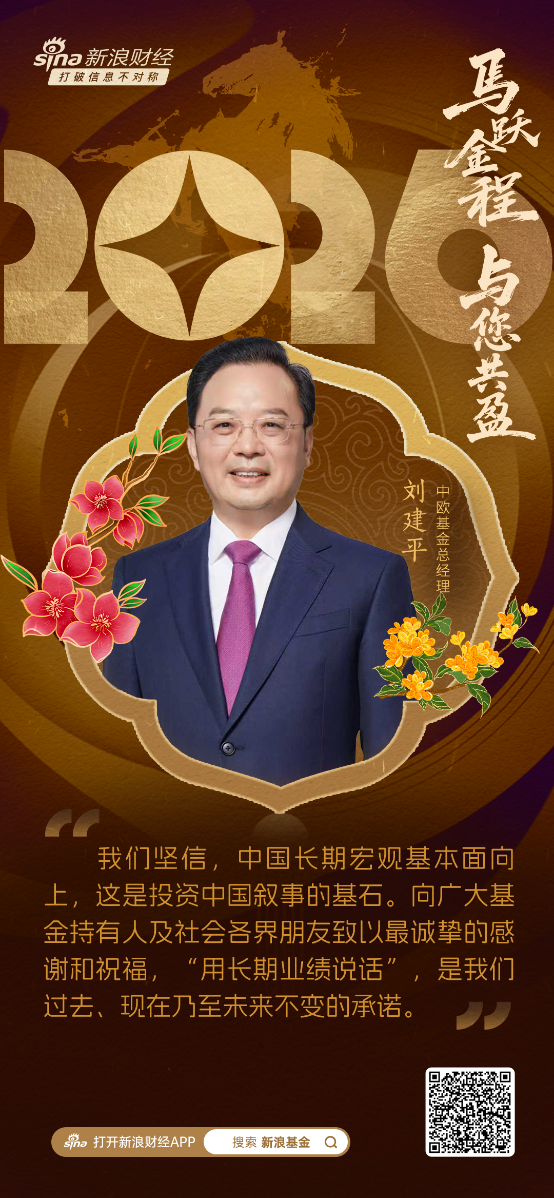 中欧基金总经理刘建平送来新春祝福。他表示,身处时代交汇处,公募基金作为金融行业服务实体经济与居民财富管理的重要力量,更应融入发展大局。中欧基金也将继续以“用长期业绩说话”为锚,以“工业化”投研体系为帆,专注提升核心投研能力,用心守护持有人的每份托付,力争提升他们的投资体验,在财富管理的大时代中谱写新的篇章。向广大基金持有人及社会各界朋友致以最诚挚的感谢和祝福,“用长期业绩说话”,是我们过去、现在乃至未来不变的承诺。祝愿大家新春快乐,马年大吉,投资长虹,万事胜意!