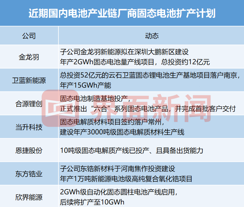 应用端需求爆发,使得今年成为固态电池产业化的关键节点。欣旺达、亿纬锂能计划今年推出全固态电池,孚能科技、巨湾技研计划实现Gwh级别固态电池产能。在产业终端,广汽集团计划2026年实现全固态电池装车,上汽集团预计2026年正式量产全固态电池。多家厂商也在近期公开了扩产计划。
