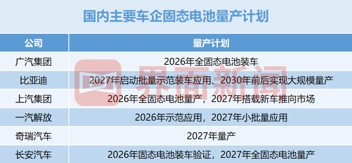 车企也在加紧布局自有产线。比亚迪在2024年完成了60Ah全固态电池的中试下线,计划2027年左右启动批量示范装车应用、2030年前后实现大规模量产。也有市场消息提到比亚迪正在加紧推进GWh级别的全固态电池设备招标。广汽集团研发的30Ah全固态动力电池能量密度达400Wh/kg,计划在2026年昊铂旗下车型搭载全固态电池。