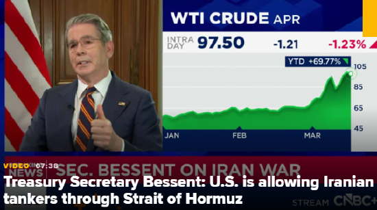 - 美国财政部长斯科特・贝森特对 CNBC 表示,美国正允许伊朗油轮通行霍尔木兹海峡。