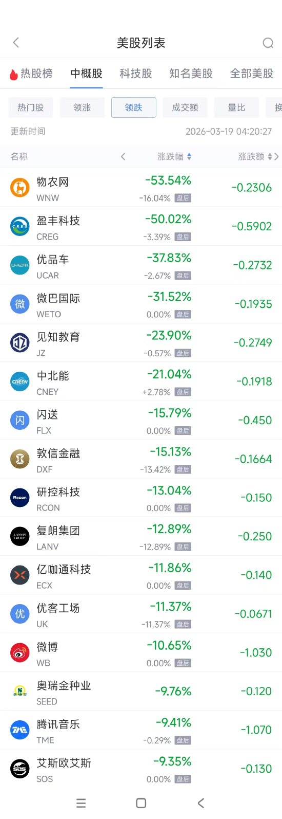上涨股当中(按市值从高到低),跌1.80%,巴巴跌1.46%,跌3.50%,跌1.57%,跌0.76%,跌1.19%,携程跌0.86%,跌0.61%,跌2.36%,控股跌1.76%,跌2.76%,汽车跌5.12%,小鹏汽车跌2.09%,跌9.50%,跌3.78%,跌2.35%,跌4.71%,满帮跌6.70%,跌2.74%,BOSS直聘跌5.91%,名创优品跌2.74%,亚朵集团跌1.49%,小马智行跌1.43%,跌0.62%,传媒跌0.90%,禾赛科技跌0.69%,科技跌2.88%。