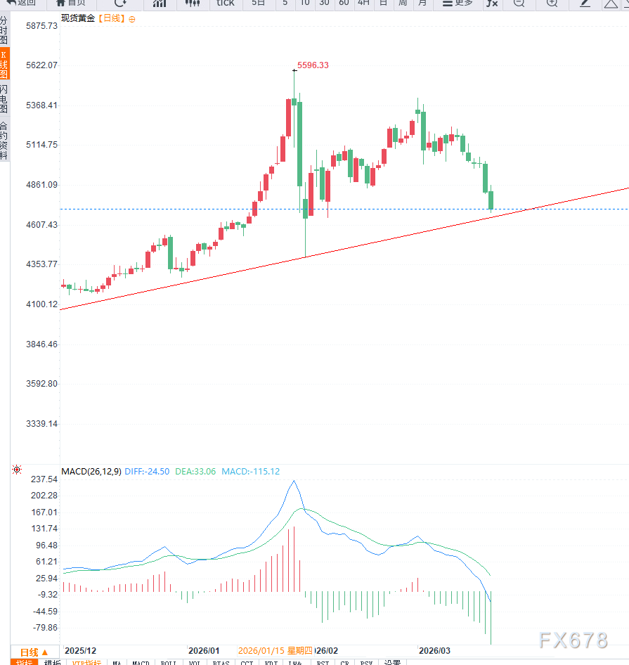 然而,随着市场环境变化,上述驱动因素正在出现明显的边际转弱甚至反向演变,黄金市场正从单边上涨逐步过渡至调整阶段。从当前市场结构来看,最关键的变化来自于货币政策预期的重塑。此前市场普遍预期美联储将较快进入降息周期,但随着能源价格上涨推高通胀预期,以及最新政策会议释放出明显偏鹰信号,市场开始重新评估利率路径。这一变化意味着此前被充分计价的降息预期正在被修正,甚至出现“降息预期反噬”的情况,从而对黄金价格形成直接压制。在利率逻辑之外,避险资金流向的变化同样值得关注。尽管地缘风险仍在持续,但黄金并未获得与之匹配的上涨动能,反而表现出明显的高位承压特征。这表明当前避险资金正在发生分流,更多流入美元资产而非黄金。在美元具备流动性优势与利率优势的背景下,其避险属性阶段性强化,从而削弱黄金的吸引力。这种“避险不再单向利多黄金”的结构变化,是当前市场的重要特征之一。与此同时,商品市场整体表现亦对黄金形成间接压力。有色金属价格普遍走弱,反映出市场对全球经济需求的预期趋于谨慎,同时也意味着资金正在从大宗商品板块流出。在这种背景下,黄金难以独立走强,反而更容易受到资金再配置的拖累,进一步加剧调整压力。从技术结构来看,黄金当前正处于关键趋势节点。4700美元附近对应中期上升趋势线位置,同时也是前期上涨过程中的重要支撑区域,该位置构成中期趋势的核心分水岭。一旦有效跌破,意味着此前的上升结构被破坏,市场将从“上涨趋势中的回调”转入“中级调整阶段”。在下行空间测算方面,4500美元构成首个重要目标区域,该位置对应前期密集成交区与心理关口,具有较强支撑意义。若4700美元失守,市场可能快速向该区域靠拢。而若4500美元进一步被跌破,则不排除向更低区间延伸的可能性,届时调整级别将进一步扩大。