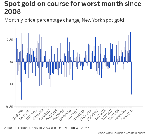 现货金价本月预计下跌 14.6%,将是 2008 年 10 月以来最大单月跌幅 —— 当时金价暴跌 16.8%。